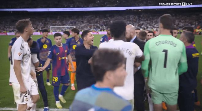 库尔图瓦随即跑过来,他和亚马尔不得不被人分开,加西亚、德容和马克-卡萨多等人都上前劝阻。在双方球员和工作人员交织如丛林般的混乱中,迪亚斯与费兰-托雷斯、米利唐与加西亚争论不休,而阿隆索和楚阿梅尼则拉着米利唐离开。